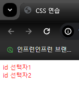 결과를 보면 분명 id 선택자는 중복사용이 불가능하다 했는데 두 div 태그 모두 글씨가 빨간색으로 출력되고 있다. id의 중복사용으로 발생하는 문제점은 css가 아닌 자바스크립트에서 발생한다. 즉, id 선택자를 중복사용해도 괜찮은것처럼 보일지몰라도 나중에 자바스크립트를 반영하여 웹페이지를 만들고자 할때 큰결함으로 다가올 수 있다. 다시한번 강조하면 HTML 규정상 id 선택자의 중복사용은 불가능하다. 대신 중복사용이 가능한 class 선택자가 있으니 안심하자.
