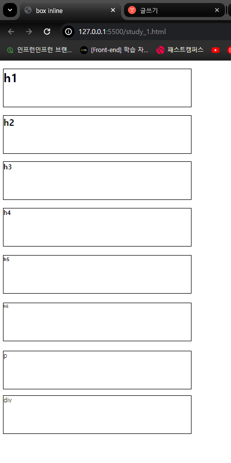 - block요소인 대표적인 태그는 <h1~h6>,<div>,<p> 등이 있다.